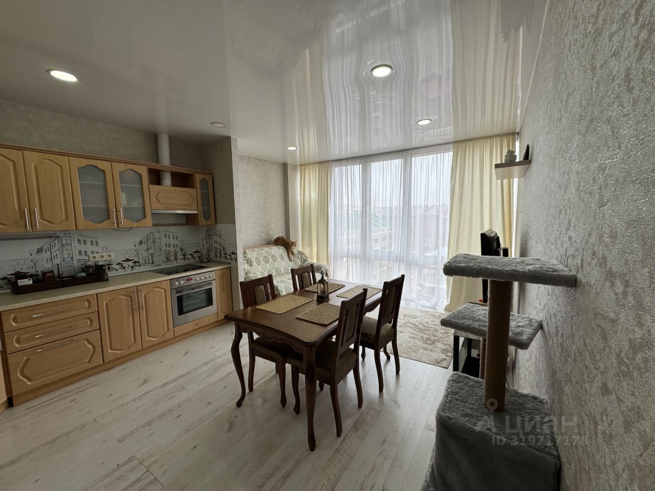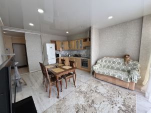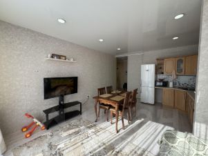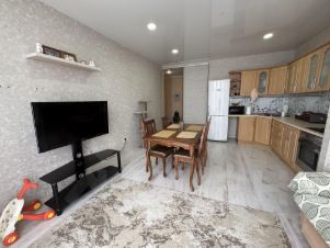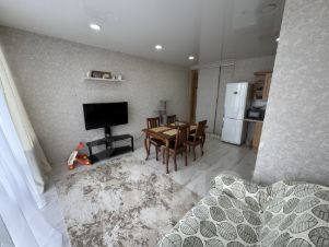 В свое время выполнен качественный капитальный ремонт. Натяжные потолки, установлены стеклопакеты, выровнены стены и пол. Требуется кое где освежить настенное покрытие (обои). В санузле полностью керамическая плитка напольная и настенная до потолка.