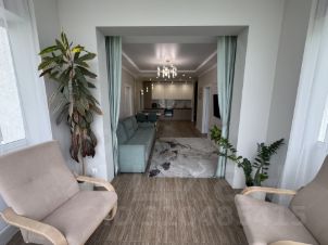 В квартире две детских комнаты, взрослая спальня с гардеробом, прихожая с гардеробом, два санузла (один с душем, второй с ванной), просторная кухня-гостиная с терассой.