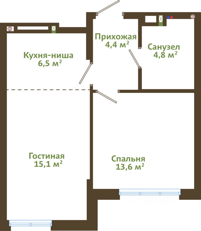 Общая площадь44,4 м²