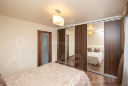 В спальне предусмотрено место для крепления телевизора на неподвижной центральной части большого шкафа-купе, а также розетки внутри для удобства подключения. Кровать с подъемным механизмом и дополнительным местом хранения.