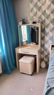 В спальне полностью остаётся спальный гарнитур (кровать, комод, шкаф с зеркалом, пуф).