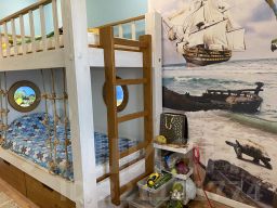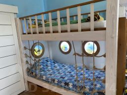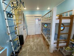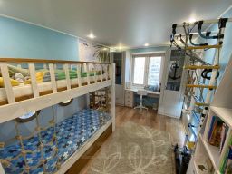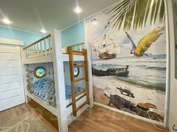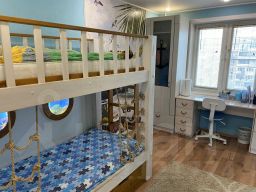 6) Детская комната с дизайнерским ремонтом. Бонусом новым жильцам остаются детские книги, игрушки, двухэтажная кровать с подстветкой, шкафы и зона для учебы.