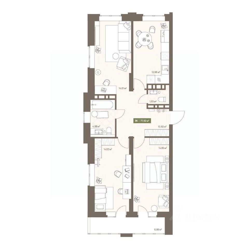 В жилом комплексе NOVA на Московском в продаже квартира N 105 площадью 77.92 кв.м. Кирпич от фасадов до межкомнатных стен, высокие потолки, большие окна и остекленная лоджия. Квартира сдается в отделке white box. 17-этажный дом, с последних этажей которого открываются панорамные виды на город.