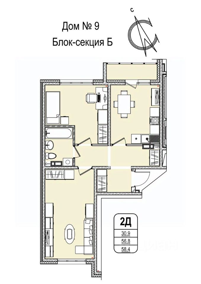 Продаётся 2-комнатная квартира в строящемся доме (Дом 9), срок сдачи: IV-кв. 2025, общей площадью 58.4 кв.м., на 2 этаже.