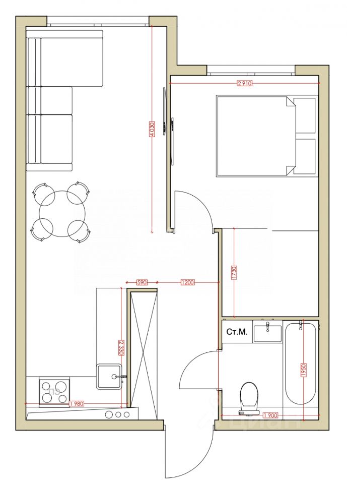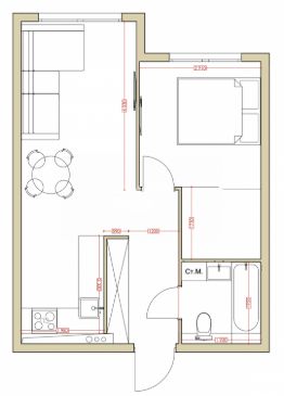 Планировка квартиры продумана до мелочей: на двух окнах расположились две просторные комнаты (кухня - гостиная и спальня), а также совмещенный санузел, оборудованный современной сантехникой.