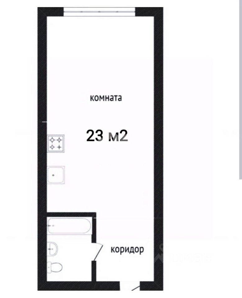 Общая площадь 23 м2, площадь жилой комнаты 17 м2, есть возможность организовать зону кухни.