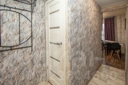• В комнатах — обои, линолеум, натяжные потолки;