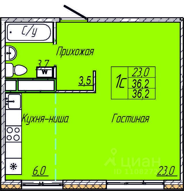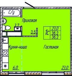 Квартира свободной планировки, 36,2 м²
