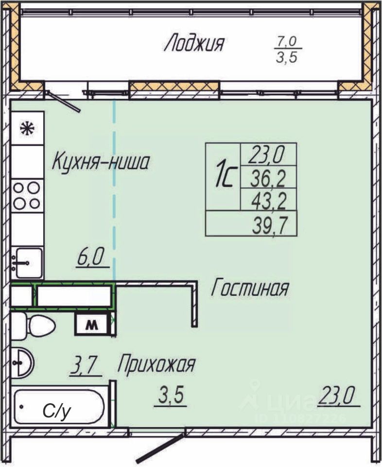 Квартира свободной планировки, 39,7 м²
