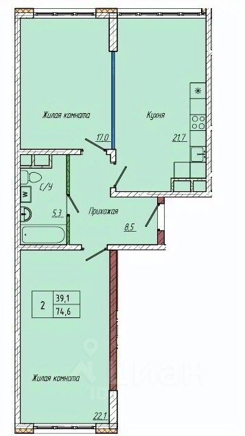 Жилая площадь39,1 м²