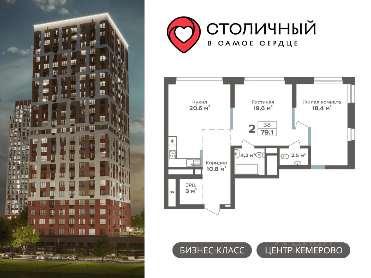 СТАРТ ПРОДАЖ НОВОГО ЖИЛОГО КОПЛЕКСА БИЗНЕСС-КЛАССА В ЦЕНТРЕ КЕМЕРОВО! !!! ИПОТЕКА ОТ 3,9%. Ежемесячный платёж от 28 300 рублей.!!! Звоните, поможем определиться с выбором квартиры, подберем самую выгодную программу кредитования и подготовим предварительный расчёт платежей. ---------------------------------------------- ЖК "Столичный" — ваше пространство для жизни, развития и отдыха. Всего 5 домов от 25 до 28 этажей. Благодаря панорамному остеклению в квартирах много света и открываются захватывающие панорамные виды на реку Томь, Красное озеро и Московскую площадь. Отделка квартир White box (ровная стяжка пола с шумоизоляцией, улучшенная штукатурка стен, разводка электрики по квартире, межкомнатные перегородки, горизонтальная разводка отопления в полу). Двухуровневый паркинг на -1 и 1 этаже с собственным автомоечным комплексом. Закрытая территория — ваш личный оазис безопасности и комфорта, где нет места для машин. Просторный двор — зона для отдыха и общения, где каждый найдет себе занятие по душе: от современных игровых комплексов до спортивных площадок, окруженных зеленью и ландшафтным дизайном. Ресепшен с консъерж-обслуживанием, куда вы можете обратиться для решения различных бытовых вопросов. Круглосуточный пост охраны на территории жилого комплекса. Премиум фитнес-клуб World Class на территории комплекса — просторные тренажерные залы, бассейны для взрослых и детей, зоны функционального тренинга, SPA-салон. Инфраструктура уже 9 баллов из 10 — здесь расположены детские сады, школа, в пешей доступности торговые центры, крупные спортивные объекты ледовый дворец "Кузбасс", спорткомплекс "Кузбасс-Арена". ---------------------------------------------- Успейте приобрести квартиру по самым низким стартовым ценам! Напишите в чат - ответим на все ваши вопросы! Пока думаете над покупкой? Сохраните это объявление в избранное, чтобы быть в курсе всех акций.