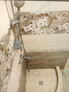 •Ванная комната и санузел совмещены, оборудована душевая из мозаичной плитки, стены и пол отделаны плиткой.