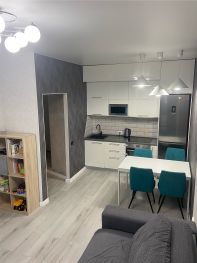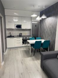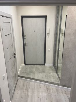 В квартире выполнен современный ремонт в спокойных тонах. Везде матовые натяжные потолки, на полу ламинат, в прихожей плитка. Санузел выложен кафелем, установлена инсталляция, чугунная ванна. Все коммуникации из меди.