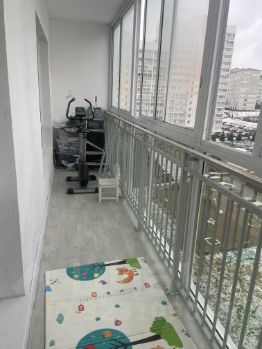 Лоджия 7,4 м2 на две комнаты, застеклена, на полу линолеум.