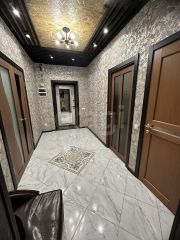Удачная перепланировка официально узаконена и позволила создать два отдельных санузла, один из которых оборудован душевой кабиной, а также полноценную ванную комнату. В отделке выделяются индивидуальные потолочные решения в гостиной и коридоре, выровненные полы и практичные напольные покрытия — плитка и линолеум.