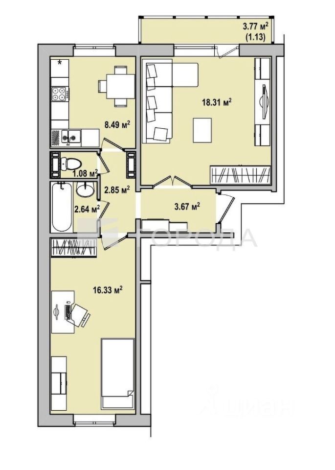 - Комнаты: две изолированные комнаты (18,31 и 16,33 кв. м), идеально подходящие для семьи.
