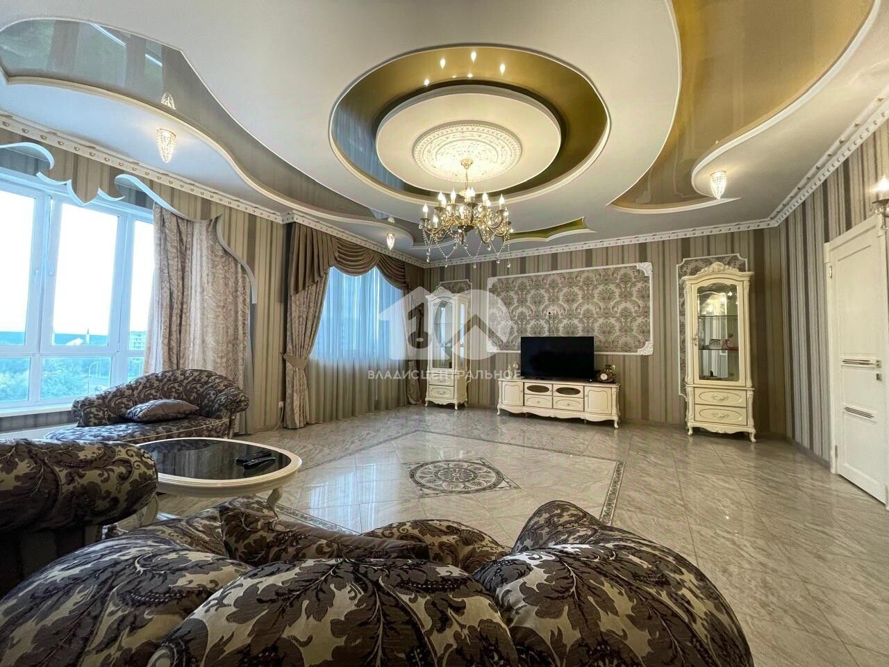 - В зале - огромные окна украшают элегантные итальянские портьеры из ткани, которые идеально гармонируют с редкими текстильными обоями, создавая целостный и утонченный образ интерьера. Все материалы и мебель, включая кухню и сантехнику, доставлены из заграницы.