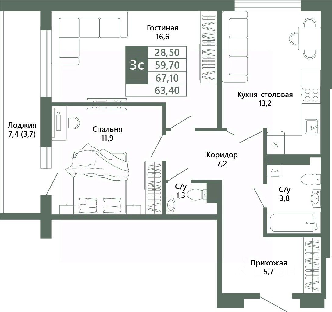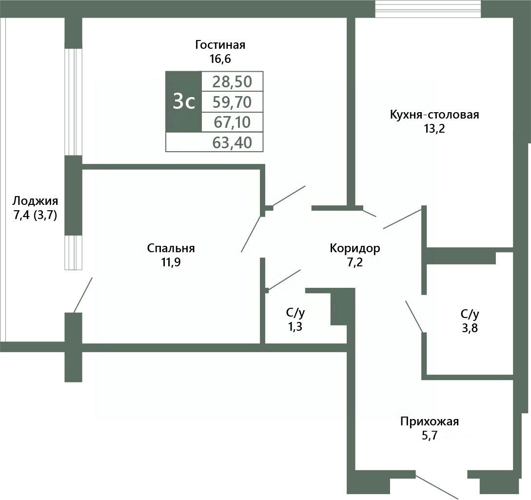 Общая площадь63,4 м²