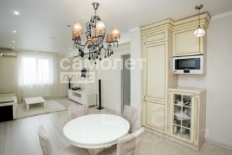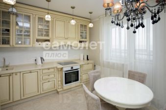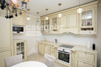 Изысканная кухня с фасадами из натурального дерева и стеклянными дверцами создаст атмосферу уюта и стиля. В квартире два санузла и вместительная гардеробная.