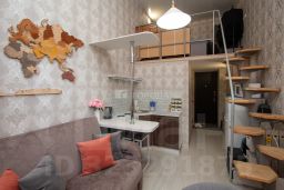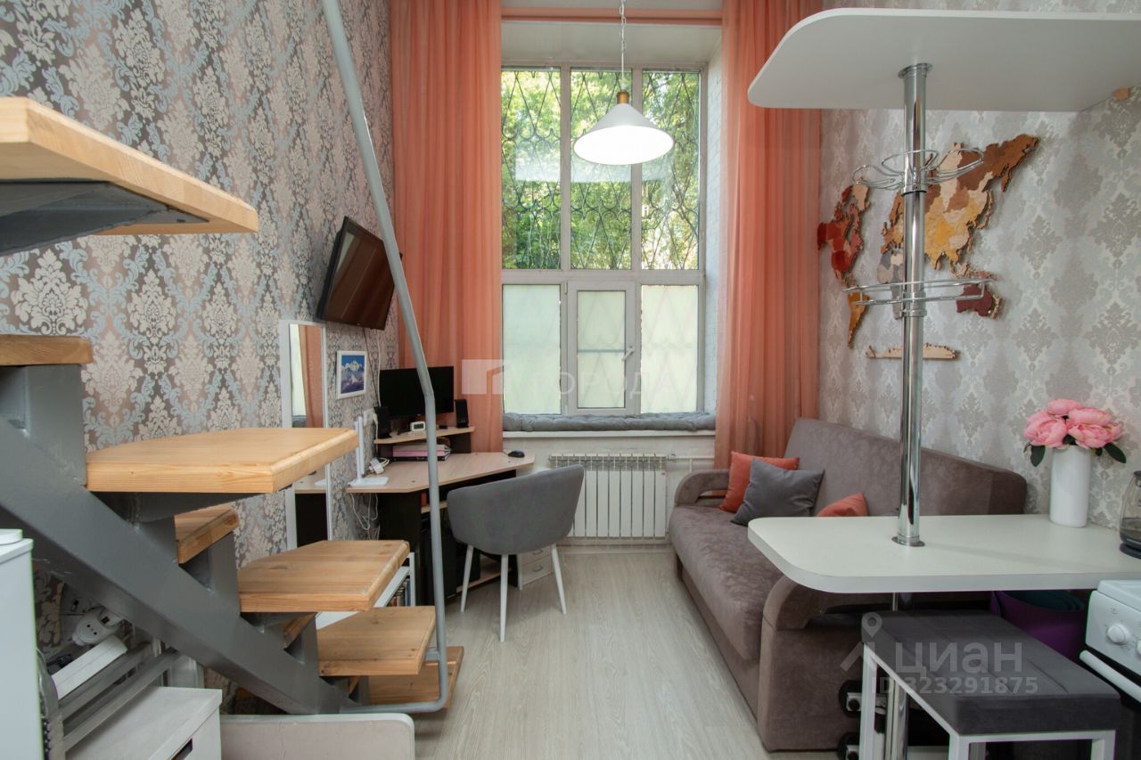 Квартира расположена на первом этаже пятиэтажного кирпичного дома 1978 года постройки. Общая площадь — 19,5 кв. м, из которых 16,5 кв. м — жилая площадь, а 3 кв. м — кухня. Высота потолков — 4 метра, что создаёт ощущение простора. Окна выходят во двор.