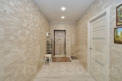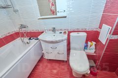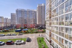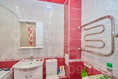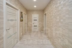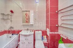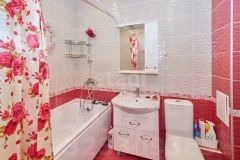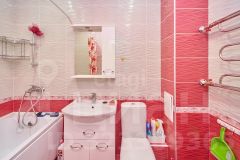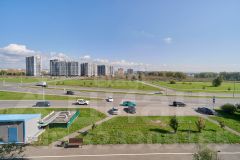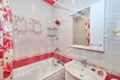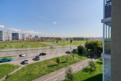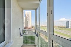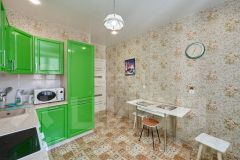 В квартире современный ремонт, панорамные окна, на полу ламинат, в кухне керамогранит, санузел совмещенный: на стенах кафель на полу керамогранит.