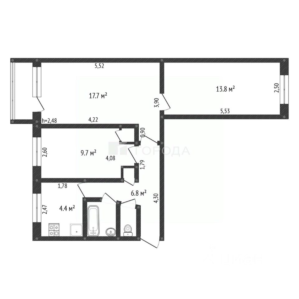 Продаётся трёхкомнатная квартира в кирпичном доме 1977 года постройки. Квартира расположена на 3 этаже 5-этажного дома. Общая площадь составляет 56 кв. м, жилая — 41,2 кв. м, площадь кухни — 4,4 кв. м.