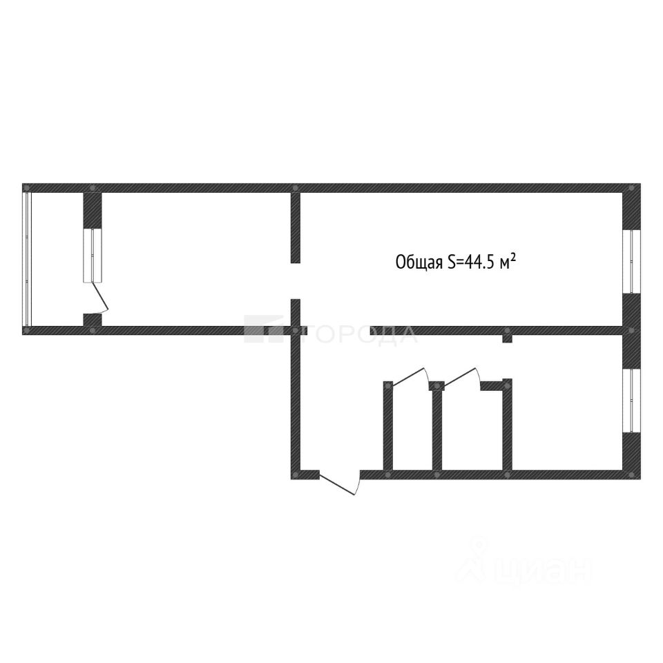 Общая площадь составляет 44,5 кв. м. Комнаты на две строны. Установлены пластиковые окна, балкон застеклен .