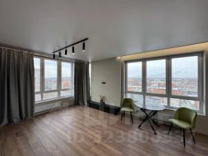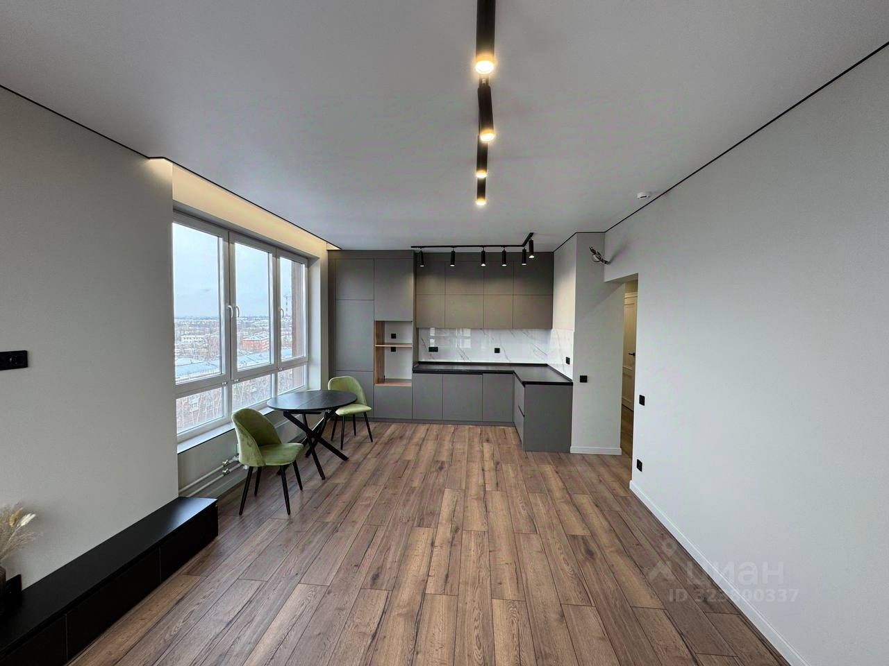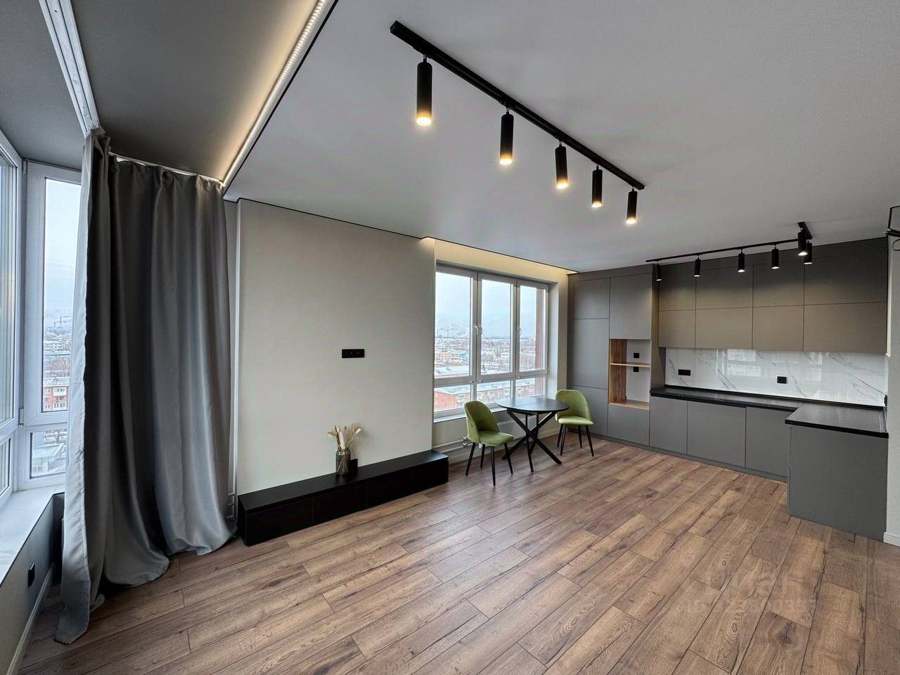 Общая площадь квартиры составляет 60кв.м., Кухня - гостинная с встроенной кухней + 2 изолированных спальни, панорамное остекление.