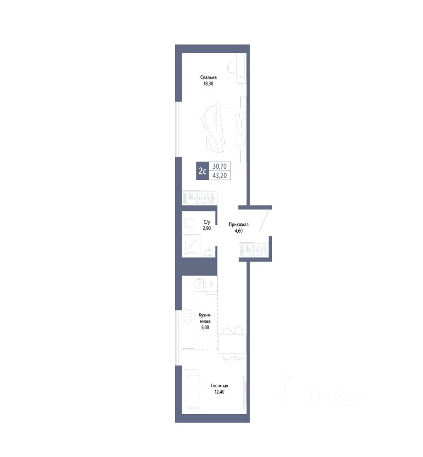 Комнаты разнесены по длине квартиры, легко выделить приватную спальню и гостевую зону. Формат идеален для пары, небольшой семьи или как ликвидный объект под аренду.
