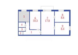 Благодаря удобной планировке со смежно-изолированными комнатами (площадь комнат: 8,6 + 8,4 + 17 + 10,3 кв. м) каждый член семьи найдёт своё пространство для отдыха и работы.