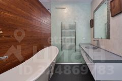 В большом санузле 9 кв.м., установлена отдельная ванная из искусственного камня Marmite, столешница из искусственного камня, встроенный душ, одна из стен декорирована лиственницей, покрытой маслом, два встроенных шкафа (один под стиральную машину Samsung, второй хоз. блок).