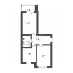Дом кирпичный, высота потолков 2,7 м, площадь квартиры 55,8 м2 и лоджия 3 м2, комнаты :16,7м2 и 15,7м2, кухня 10,1м2. Окна выходят на две стороны во двор и на бульвар Строителей.
