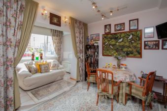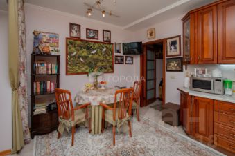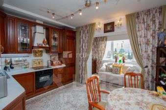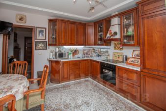 Площадь кухни-столовой (18.3кв.м.)увеличена за счет присоединения лоджии с теплым полом. Оборудована кухонным гарнитуром производства Италия, все лицевые панели из натурального дерева со встроенной бытовой техникой, установлен кондиционер. Кухня наверняка станет любимым местом сбора для семейных посиделок, приготовления вкусных блюд и приёма гостей.