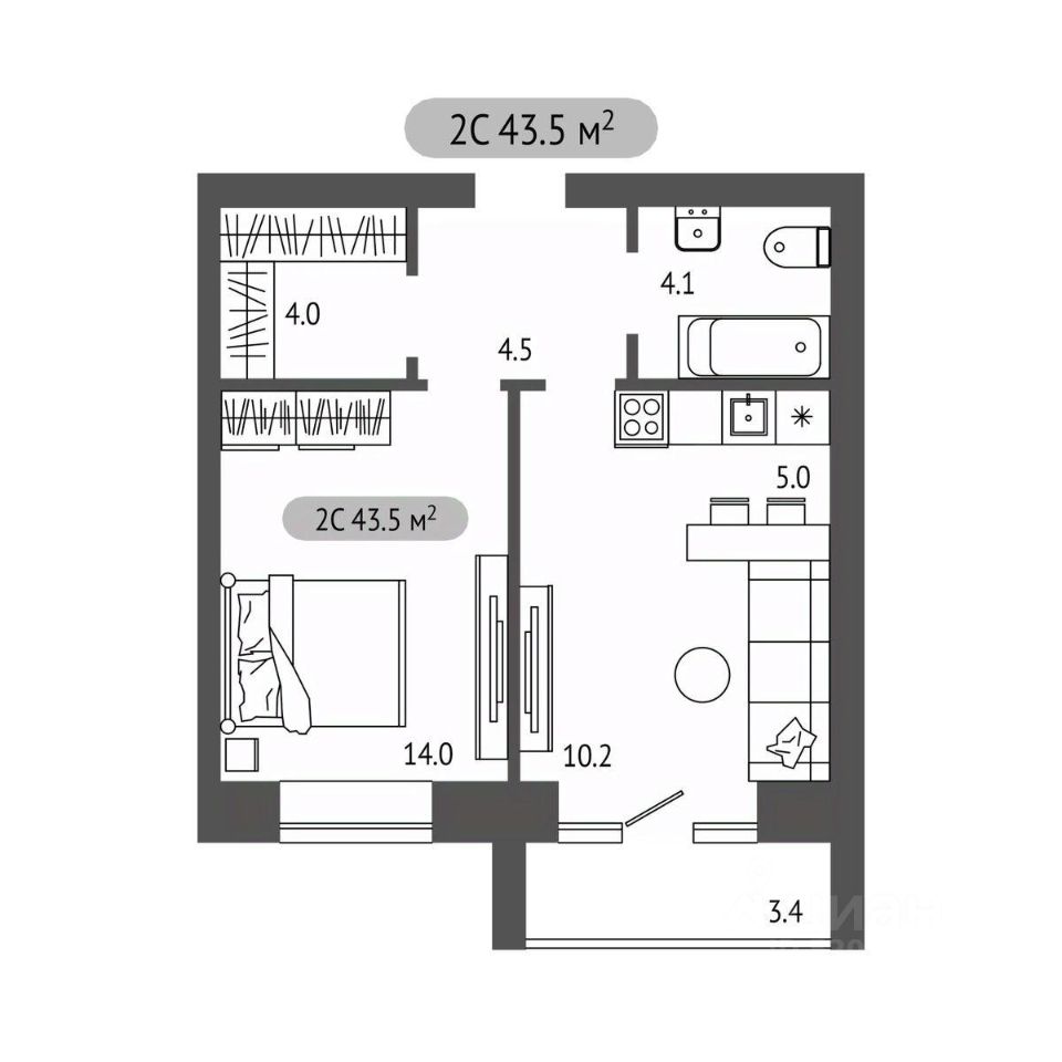 Общая площадь43,5 м²