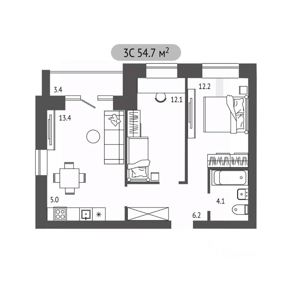 Общая площадь54,8 м²
