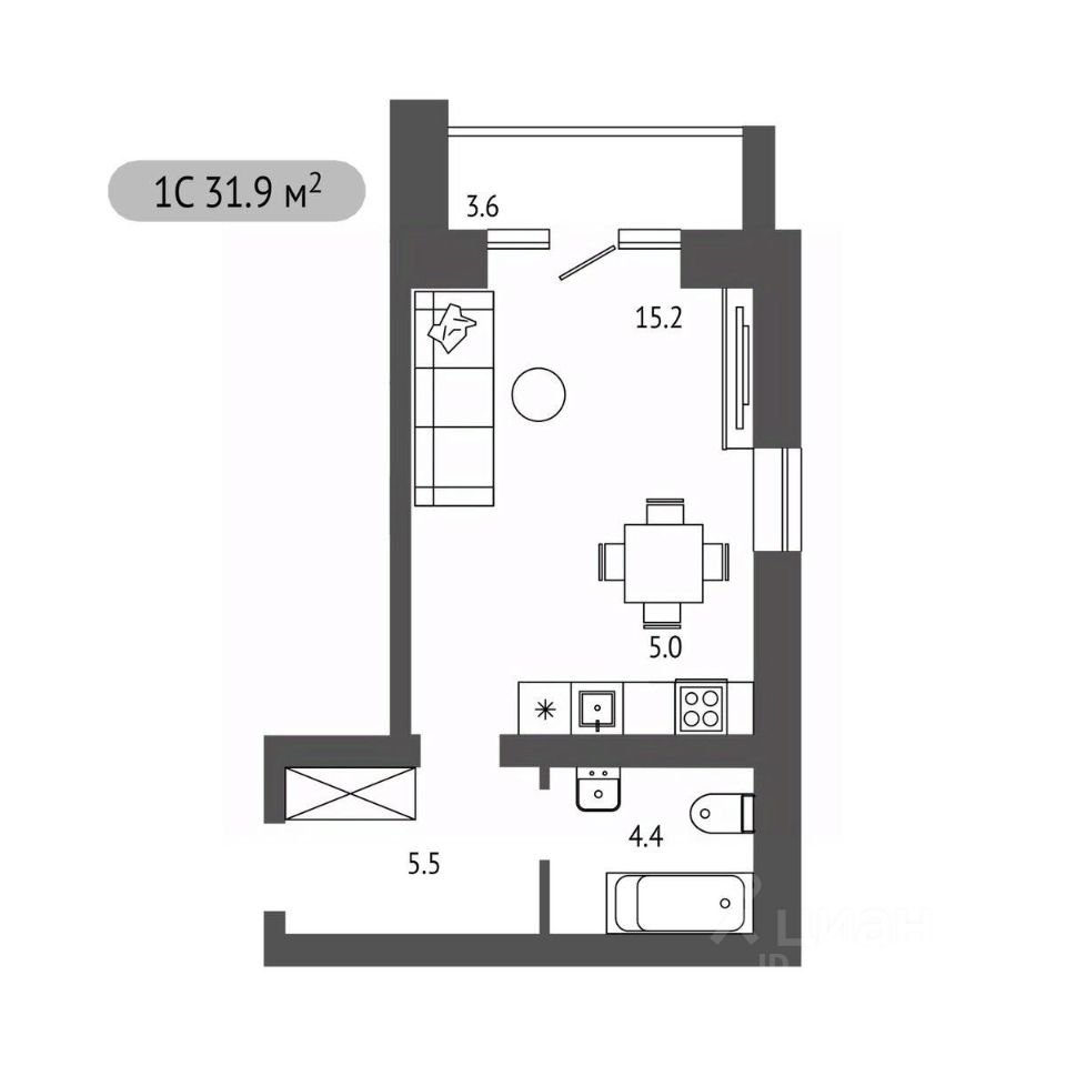 Студия, 31,9 м²