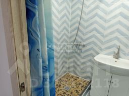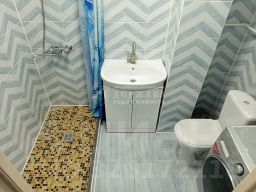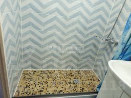 В ванной комнате керамическая плитка с узором"шевро"в светло-голубых тонах.Открытая конструкция душевой зоны ("walk-in"),упрощает уборку всего пространства. Пол поддона выложен мелкой мозаичной плиткой, что обеспечивает лучшее сцепление с поверхностью и отличное противоскольжение.