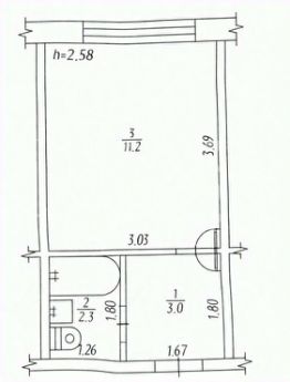 Площадь: общая — 18 кв.м, жилая — 11.2 кв.м, кухня — 3 кв.м