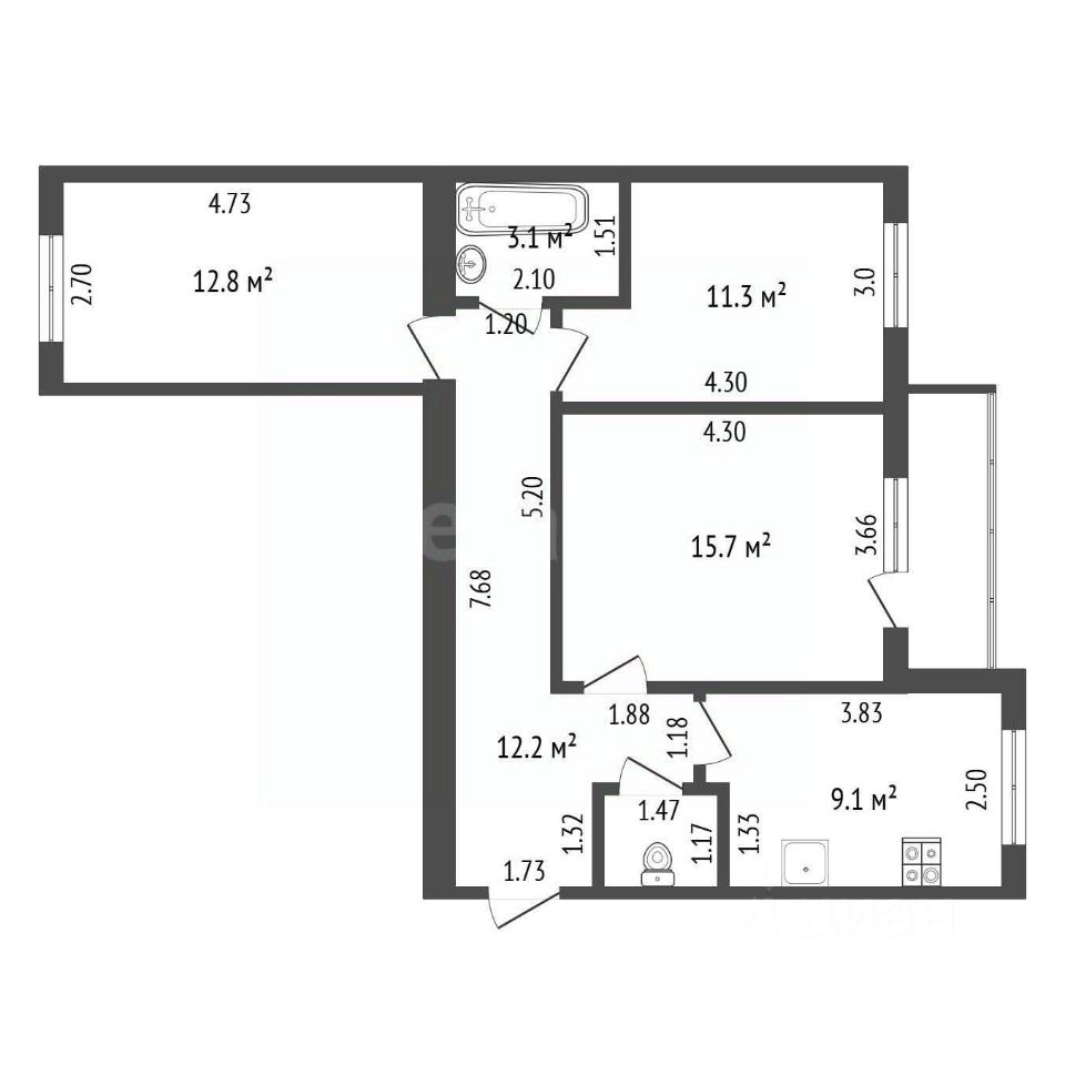Квартира отличается продуманной планировкой: просторная гостиная 15,7 м², две изолированные спальни 12,8 м² и 11,3 м², кухня 9,1 м², раздельный санузел и удобный коридор. Отделка в отличном состоянии — натяжные потолки, светлые обои, качественные напольное покрытие.
