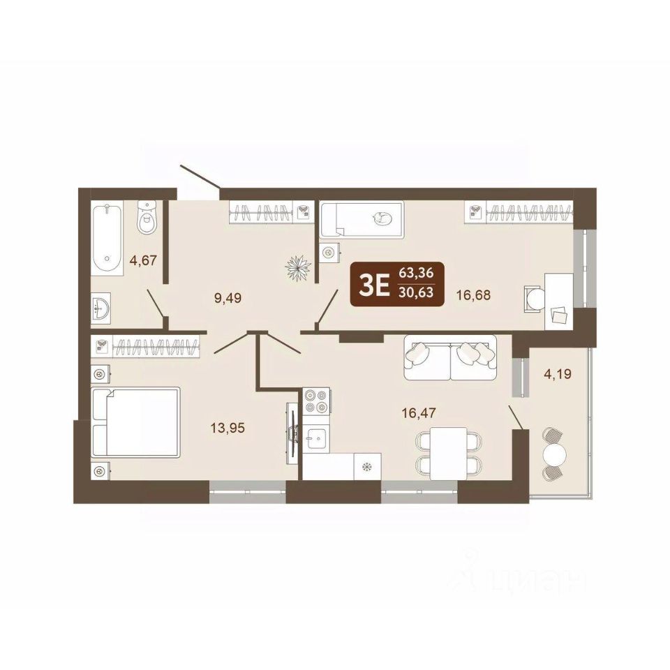 Общая площадь63,36 м²