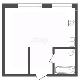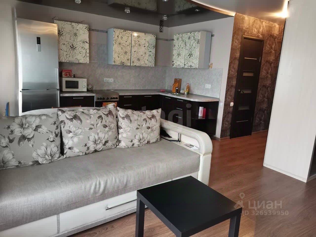 Площадь 36.8м². Удобная планировка: кухня-гостиная с двумя окнами, отдельно выделено спальное место. Потолки натяжные, пол — ламинат.