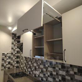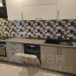 С просторной кухней в 13.3 кв.м. В кухне остается встроенная современная мебель и бытовая техника (посудомоечная машина, духовой шкаф, вытяжка).