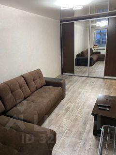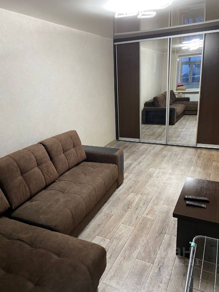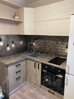Кухня площадью 6 м² оборудована современной техникой, включая холодильник, и стильной мебелью с элементами под кирпичную кладку. В комнате установлен удобный диван с журнальным столиком и вместительный встроенный шкаф.