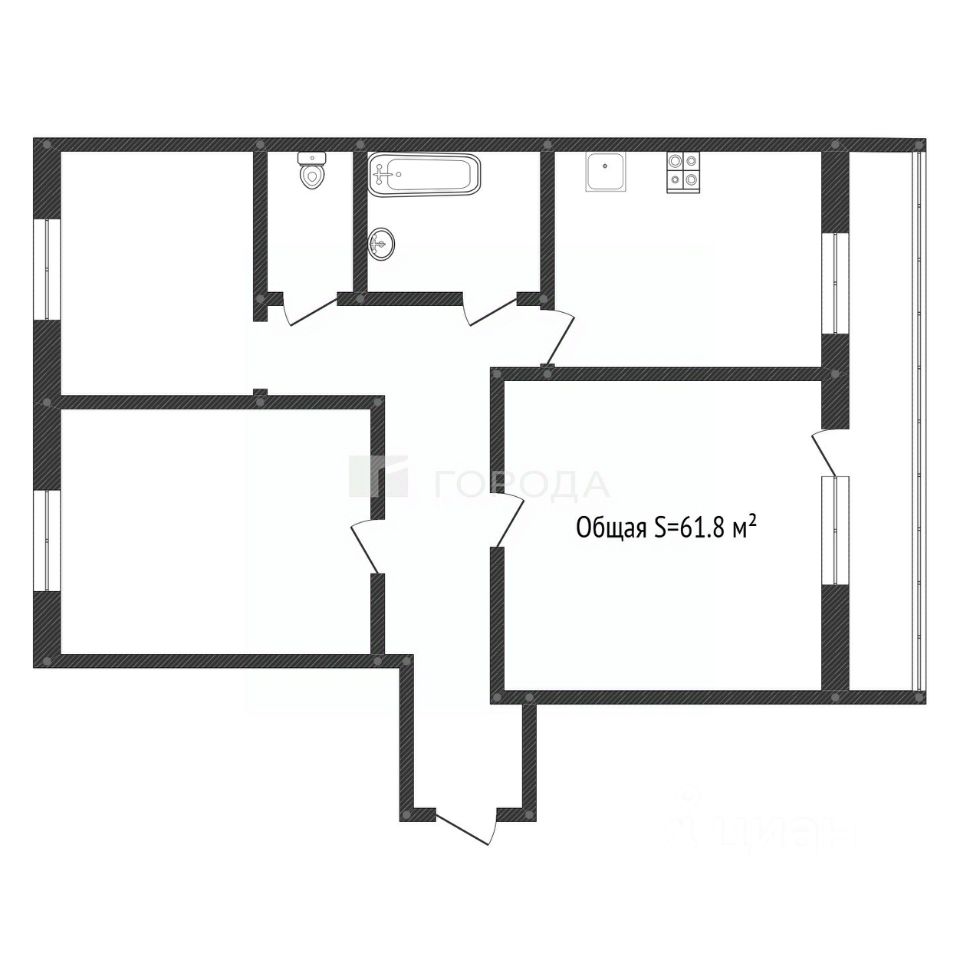 Общая площадь квартиры 61,8 кв.м, из них - кухня 9,7 кв.м, жилая площадь 37,9 кв.м.