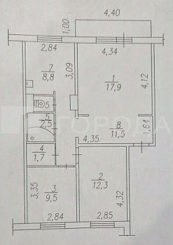 Общая площадь квартиры составляет 65,3 кв. м, жилая — 53,5 кв. м, площадь кухни — 8,8 кв. м.