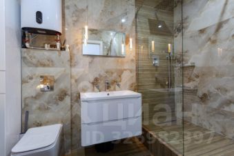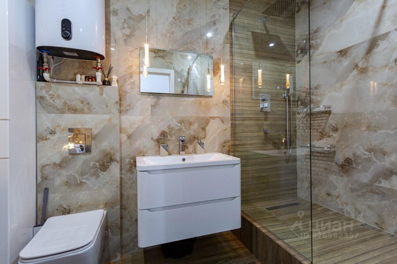 В санузле современный керамогранит, бойлер, качественная сантехника (инсталляция, душевая кабина).