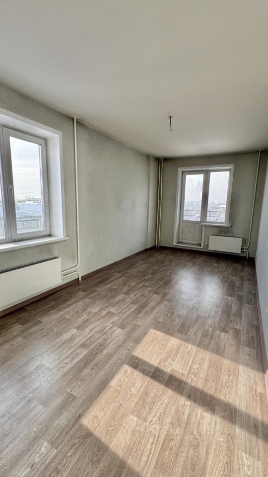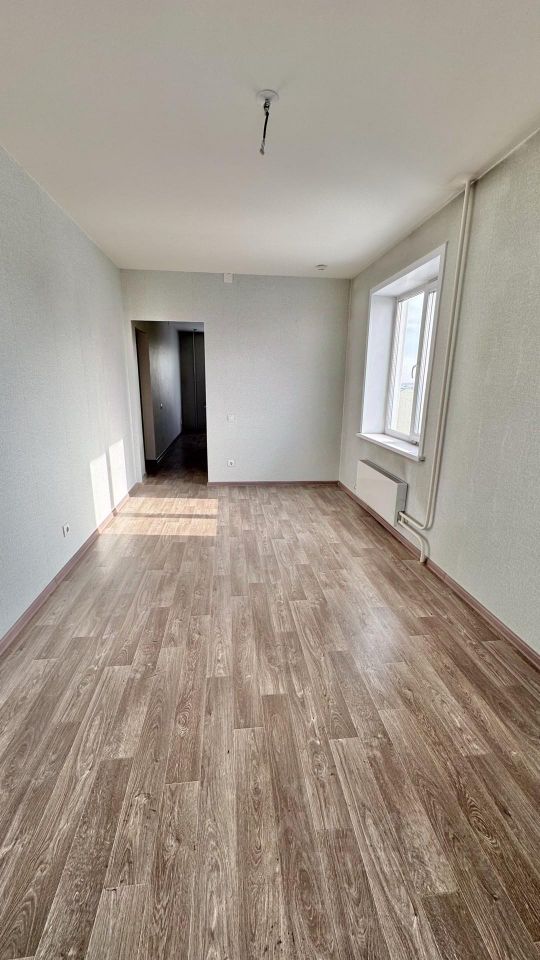 Ремонт от застройщика, ровные стены и потолки, на полу линолеум.