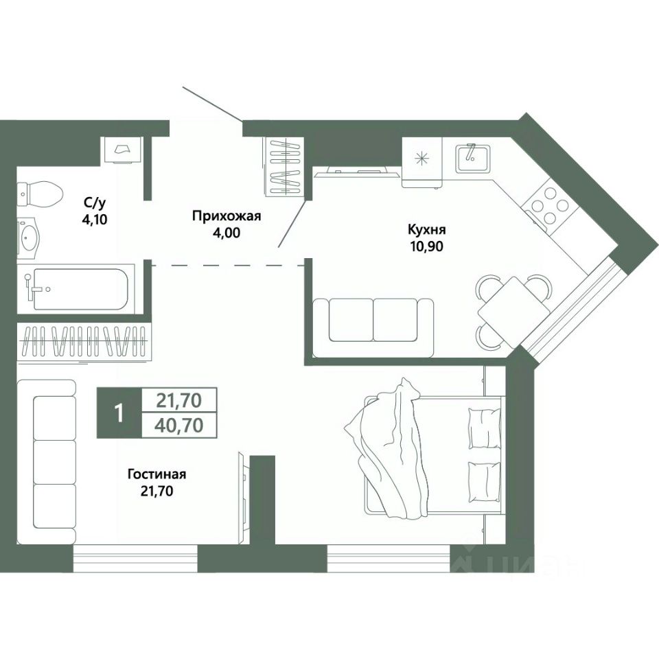 Общая площадь40,7 м²