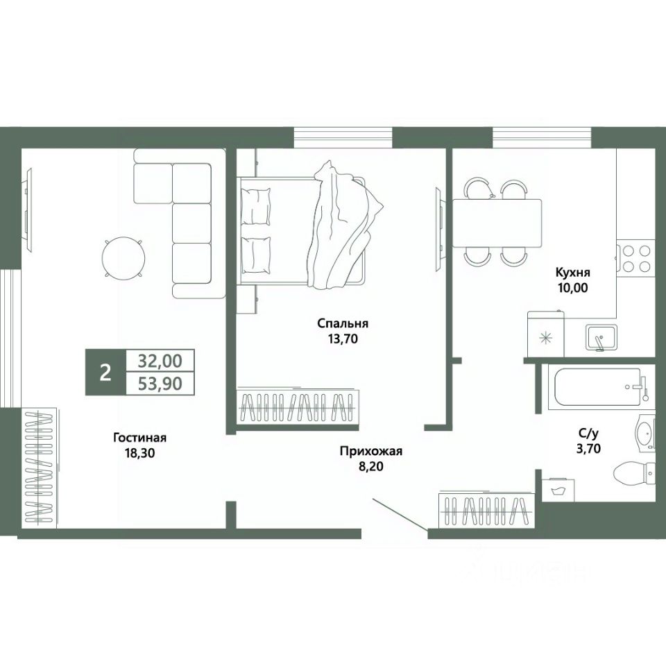 Общая площадь53,9 м²