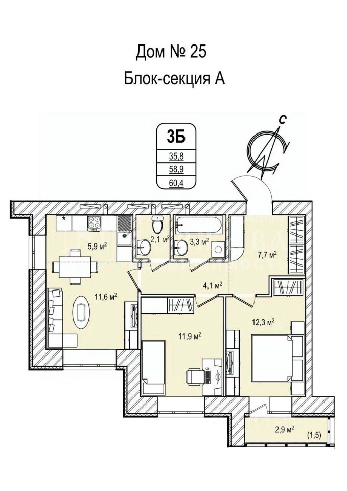 Общая площадь квартиры составляет 59,2 кв. м, жилая — 35,8 кв. м, площадь кухни — 5,9 кв. м. Высота потолков — 2,7 м. Комнаты изолированы, площадь комнат: 11,6 + 11,9 + 12,3 кв. м. Есть балкон.